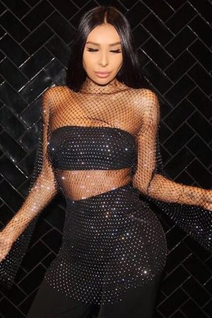 LONG SLEEVE MESH RHINESTONE DRESS – BLACK