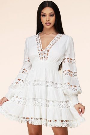 LONG SLEEVE BOHO FLOWER CROCHET DRESS – WHITE